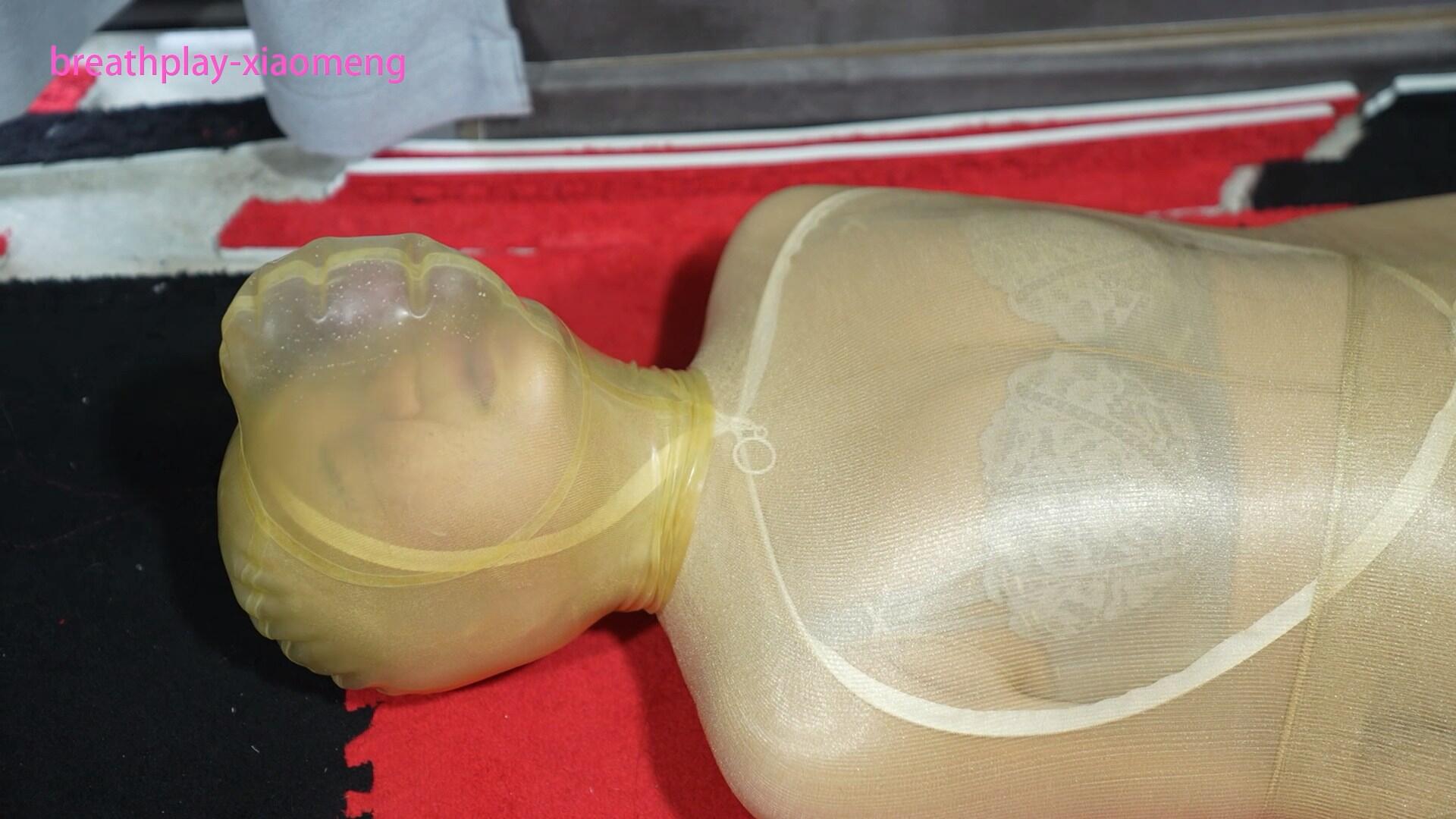 First, we encased Xiaomeng from head to toe in a sleep sack stocking, turning her into a restricted “silk cocoon.” Then, we stretched a condom over the stocking on her head. The elasticity was incredible, flattening Xiaomeng’s features against the fabric. Since the condom wasn’t inflated, she had to rely almost entirely on a single held breath. At most, a tiny bit of air might seep through the stocking fibers around her neck during her desperate inhales, but it was a mere drop in the bucket. Next, we swapped the condom for a holeless, transparent latex breathplay hood—completely sealed. Xiaomeng now had about half a breath of air to circulate back and forth, but that was it. Without any fresh air exchange, it was only a matter of time before the cocoon began to struggle violently against the stale air.