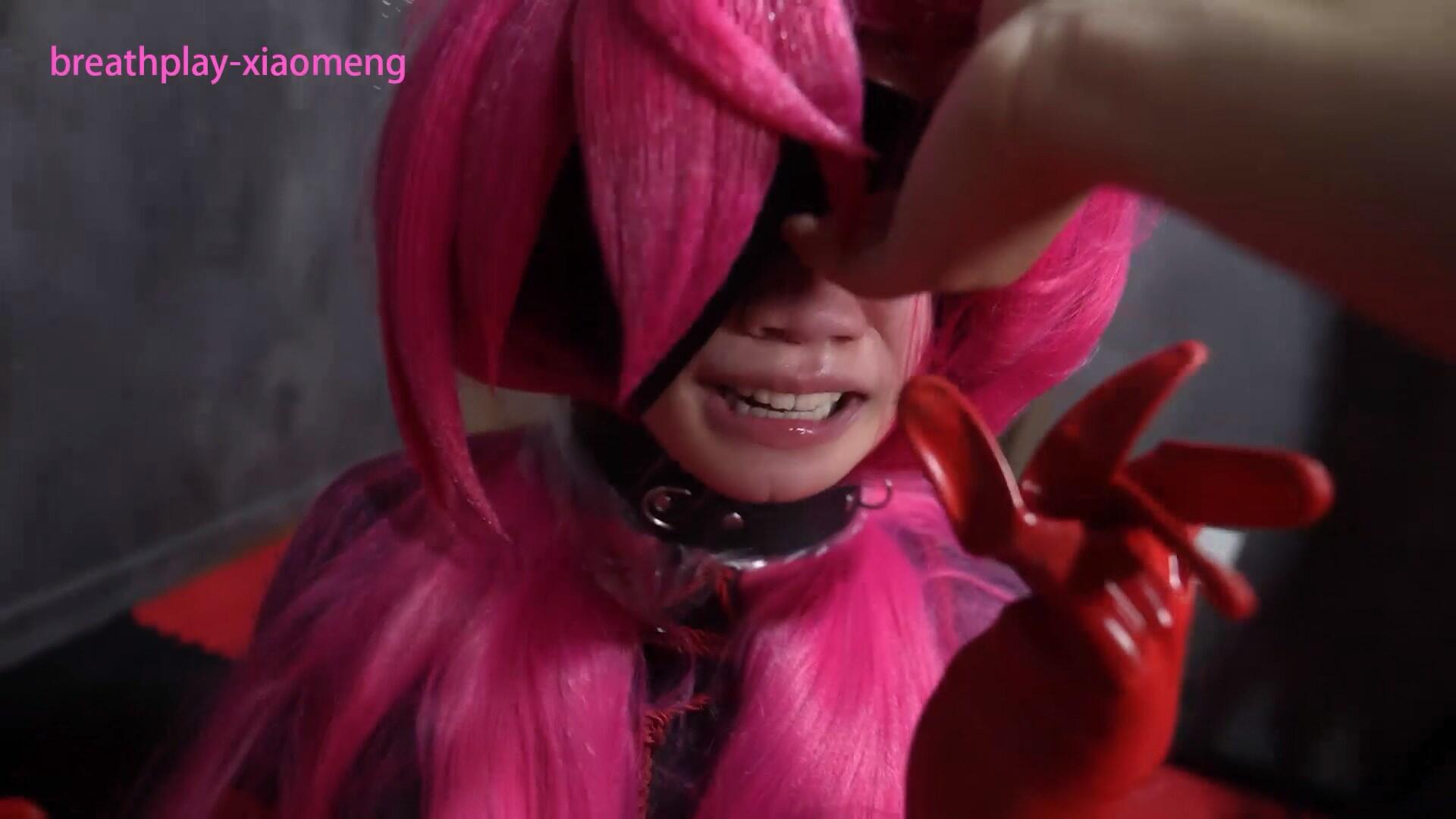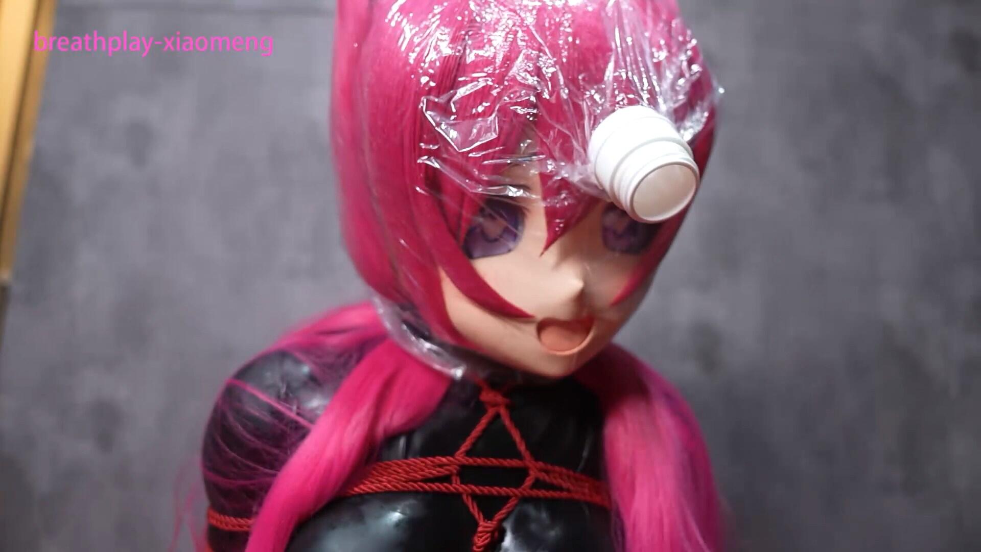 In the next sequence, to minimize the need for removing the outer bag, I attach a ventilation pipe with a sealable cap to the setup. However, because the kigurumi mask itself severely restricts air circulation, even with the cap open, the meager amount of oxygen is insufficient to alleviate Xiaomeng’s distress. Under the strain of prolonged air-limitation and repeated restriction, Xiaomeng eventually breaks into tears beneath the mask, appearing both vulnerable and captivating.