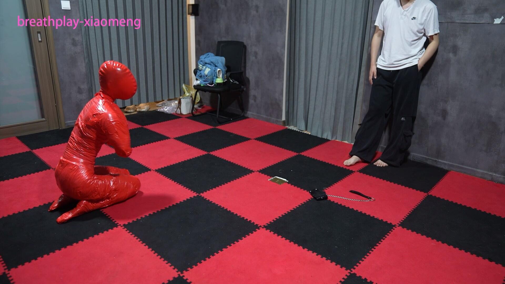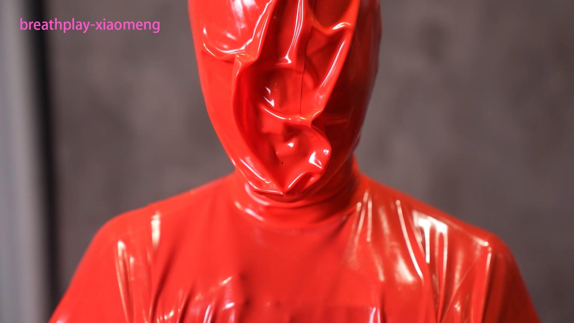 In the second half, I swapped her tape-encasement for a red human pup latex suit. To test Xiaoyu’s peak endurance under this hood, I stopped giving commands and simply had her remain in a kneeling sitting position. Xiaoyu’s lung capacity and stamina are truly impressive; every time the hood was finally lifted, it revealed that exquisite, bewitching shade of purple on her lips…